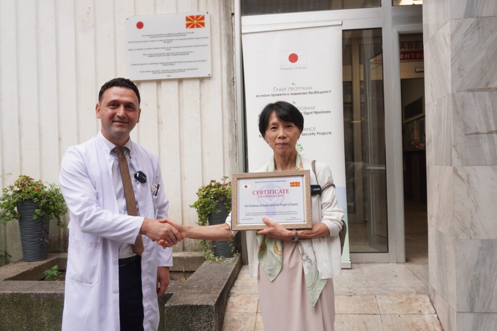 Директорот Д-р спец. Реџеп Мемеди во негово лично име и во името на целокупниот персонал на Универзитетската Клиника за детски болести- изрази голема благодарност на Амбасадата на Јапонија во РСМ, на Амбасадорката на Јапонија- нејзината екселенција г-ѓа Сецуко Кавахара и на јапонскиот народ- кои уште еднаш, со оваа значајна и вредна донација на функционален мобилен рендгенски апарат за неонатални и педијатриски пациенти, покажаа голема хуманост спрема децата, нашите пациенти, а и спрема граѓаните на нашата земја.
